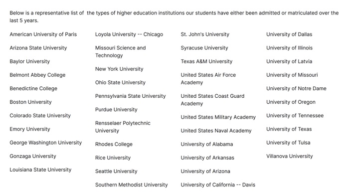 巴黎美国大学、芝加哥洛约拉大学、纽约大学、宾夕法尼亚州立大学、西雅图大学、圣约翰大学、密苏里大学、俄勒冈大学、德克萨斯大学、亚利桑那州立大学、贝勒大学、贝尔蒙特修道院学院、波士顿大学、科罗拉多州立大学、埃默里大学、乔治华盛顿大学、冈萨加大学、路易斯安那州立大学等。