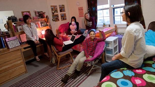 学校共有四栋宿舍楼,环绕着校园的中心草坪广场,地理位置优越,方便学生参与各类校园活动。宿舍通常为双人间,配有共用的休息室、厨房和洗衣设施,为学生提供舒适便捷的生活环境。