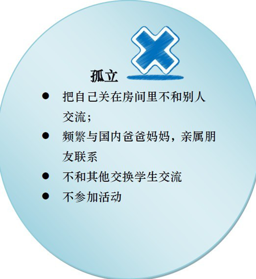要记住:每个文化都有自己的规则,文化没有对错,只有不同。你只有这一次交换的机会,不要把时间都浪费在文化冲击这件事上。一年的交换生活会过得很快,你很快就回国了,珍惜你在美国 的每一秒。多参加校园的俱乐部、演讲比赛和戏剧、体育运动、舞会等,参加这些活动你会交更多的朋友。