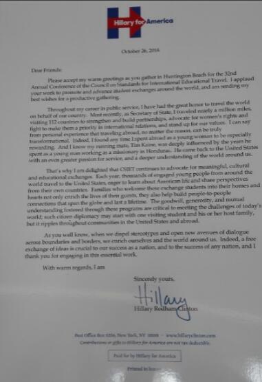 本次CSIET大会惊喜的收到了美国前总统克林顿夫人、前国务卿、新一届美国总统竞选人希拉里的贺信,为大会顺利举行添彩,与会人员倍感鼓舞和振奋!