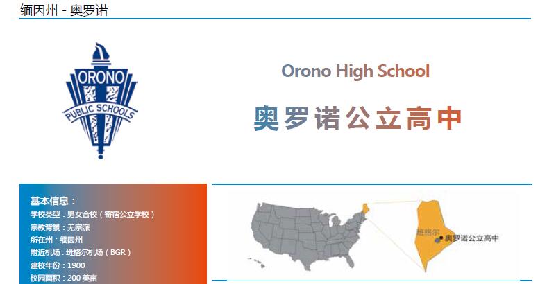 地区介绍(美国缅因州F1公立高中) 缅因州是排名第一的最安全的州,奥罗诺位于缅因州中南部,总面积近20平方英里,是缅因州最安全的城市之一。这里气候季节性差异大,夏季潮湿温暖,冬季寒冷,属于大陆性气候。地区官网:www.orono.org。地区人口:10,300,居民以青少年为主,城镇充满活力。附近机场: 班格尔机场(BGR)。位于班格尔东北方向,约15分钟车程。