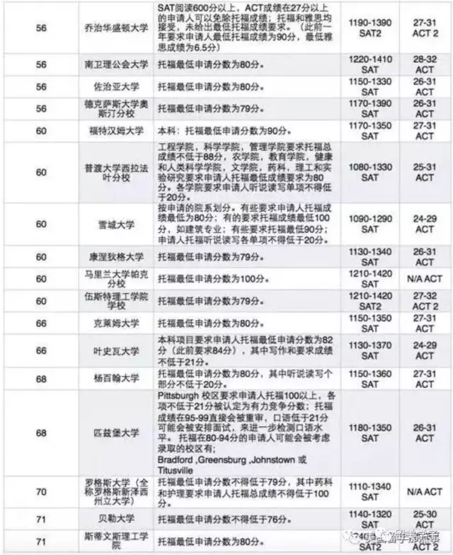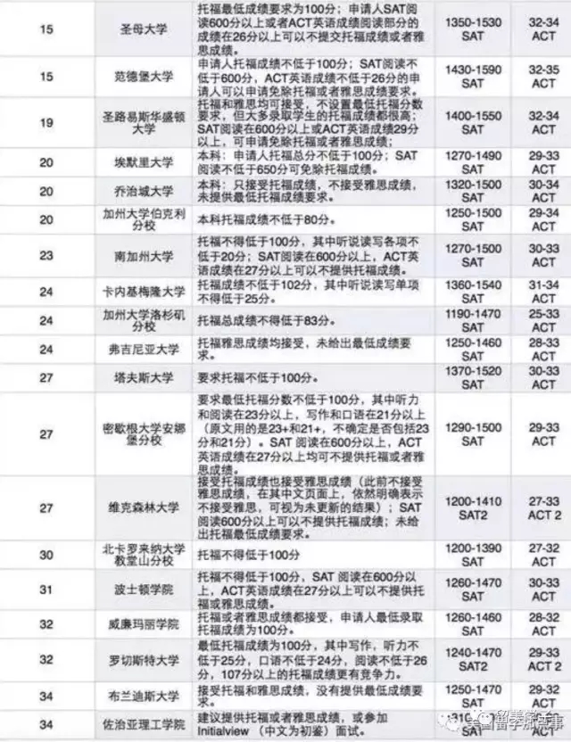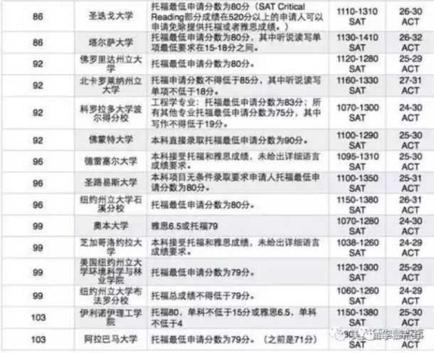 美国前100所大学标化考试门槛SAT / ACT / 托福 成绩对照表