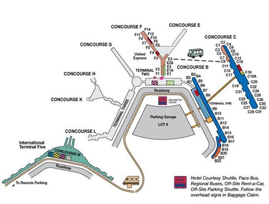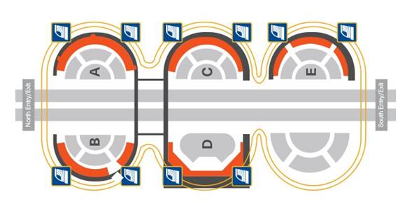 达拉斯机场一共有5个航站楼,其中Terminal D是国际航站楼。航站楼之间可以乘坐小火车(也就是下图中的橙色线条),每个航站楼内不还有bus可以乘坐,基本解放双腿!