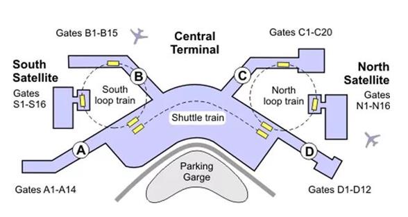 可能看了这张图就会有人问,什么叫做South Satellite?这就要拿出我们的机场地图了